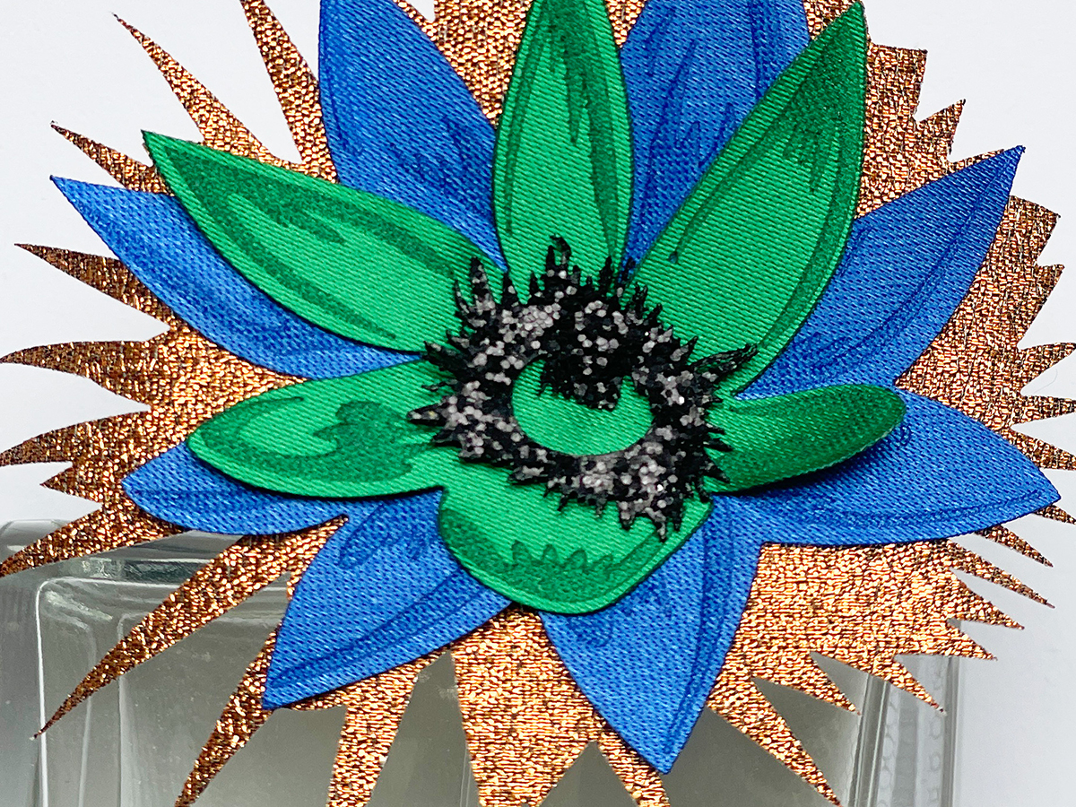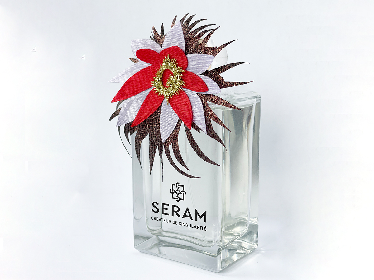 Ces assemblages de matières textile, Glitter, satin, lamés… sont d’abord découpés et gravés à la machine laser, puis montés sur bague élastique incluant une pièce de décentrage pour que le décor se positionne parfaitement sur le flacon.