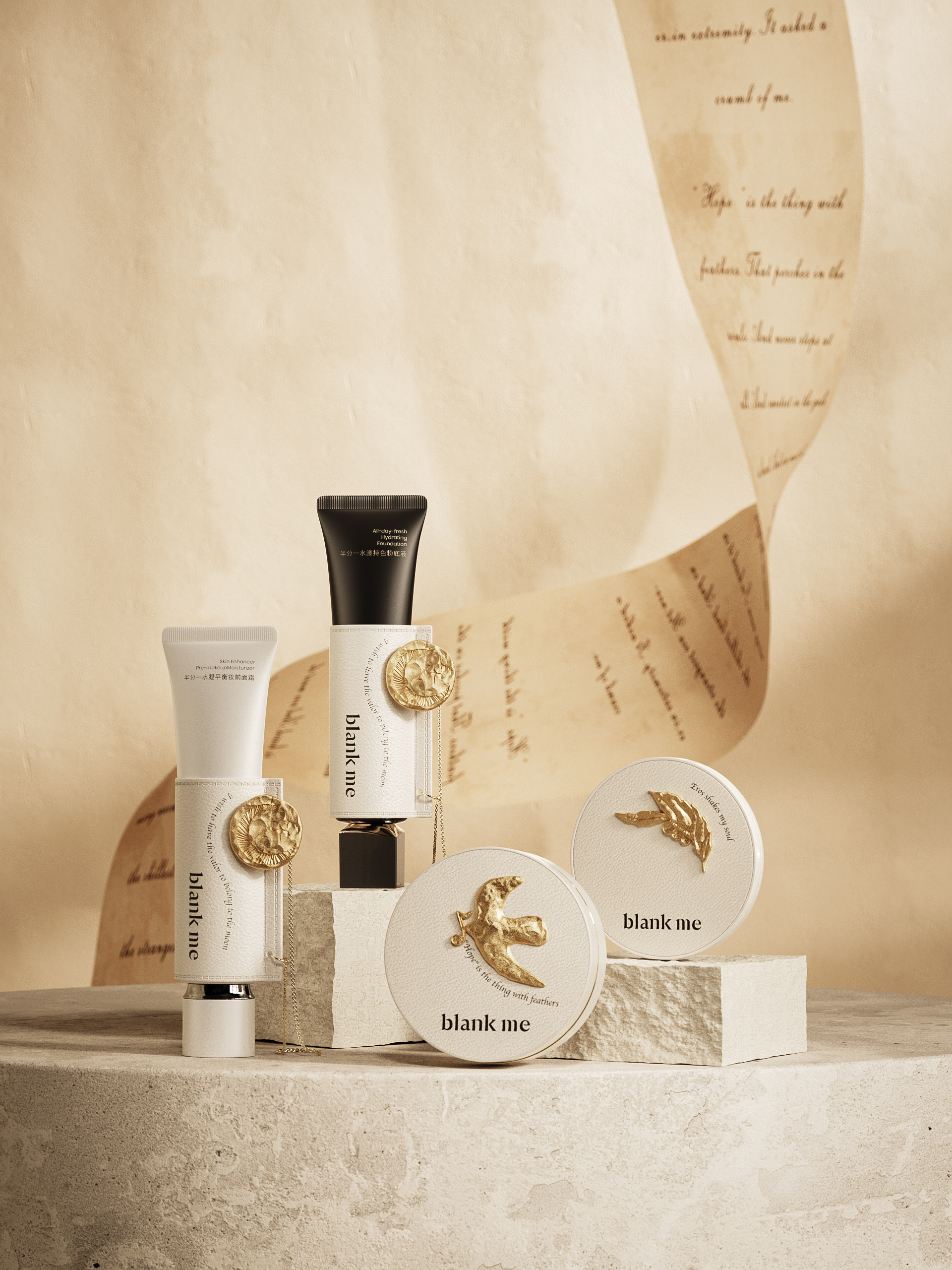 SERAM a développé, pour la marque chinoise Blank Me, spécialisée dans les produits de beauté et de soins de la peau, trois décors de maquillage en PU et ZAMAK. Ces ornements combinent plusieurs techniques : lamination, sérigraphie, marquage à haute fréquence, injection, galvanisation…