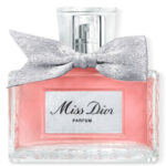 Le flacon en verre plissé emblématique de la ligne s’habille d’un nouveau ruban beige en polyester recyclé, noué au col et ourlé de surpiqûres en fils rose, développé et confectionné par SERAM.