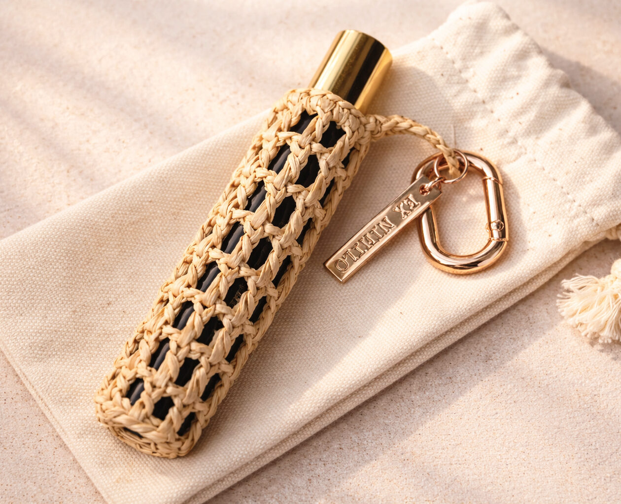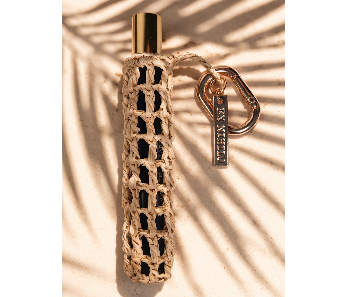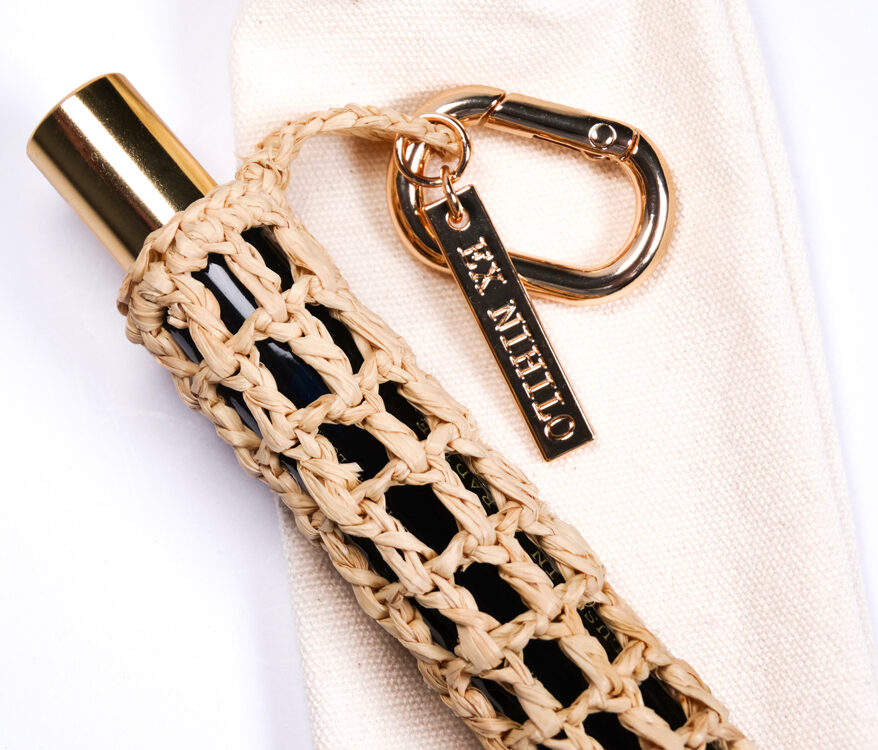Nos équipes ont conçu un écrin en raphia, entièrement tressé à la main dans nos ateliers de Madagascar, destiné à envelopper la miniature du parfum. L’ensemble est rehaussé par des éléments en métal Zamak : un mousqueton et une étiquette gravée « EX NIHILO », ainsi que par un pochon en coton pensé pour accueillir et protéger l’ensemble.