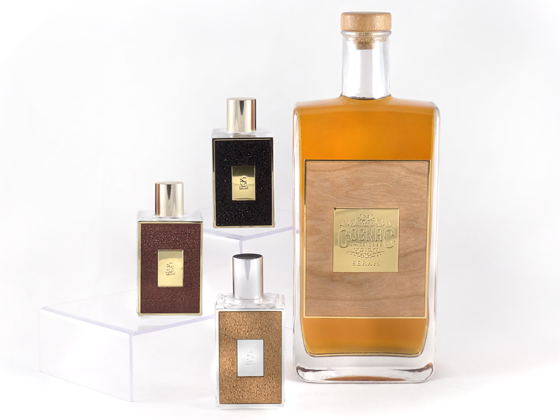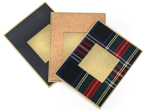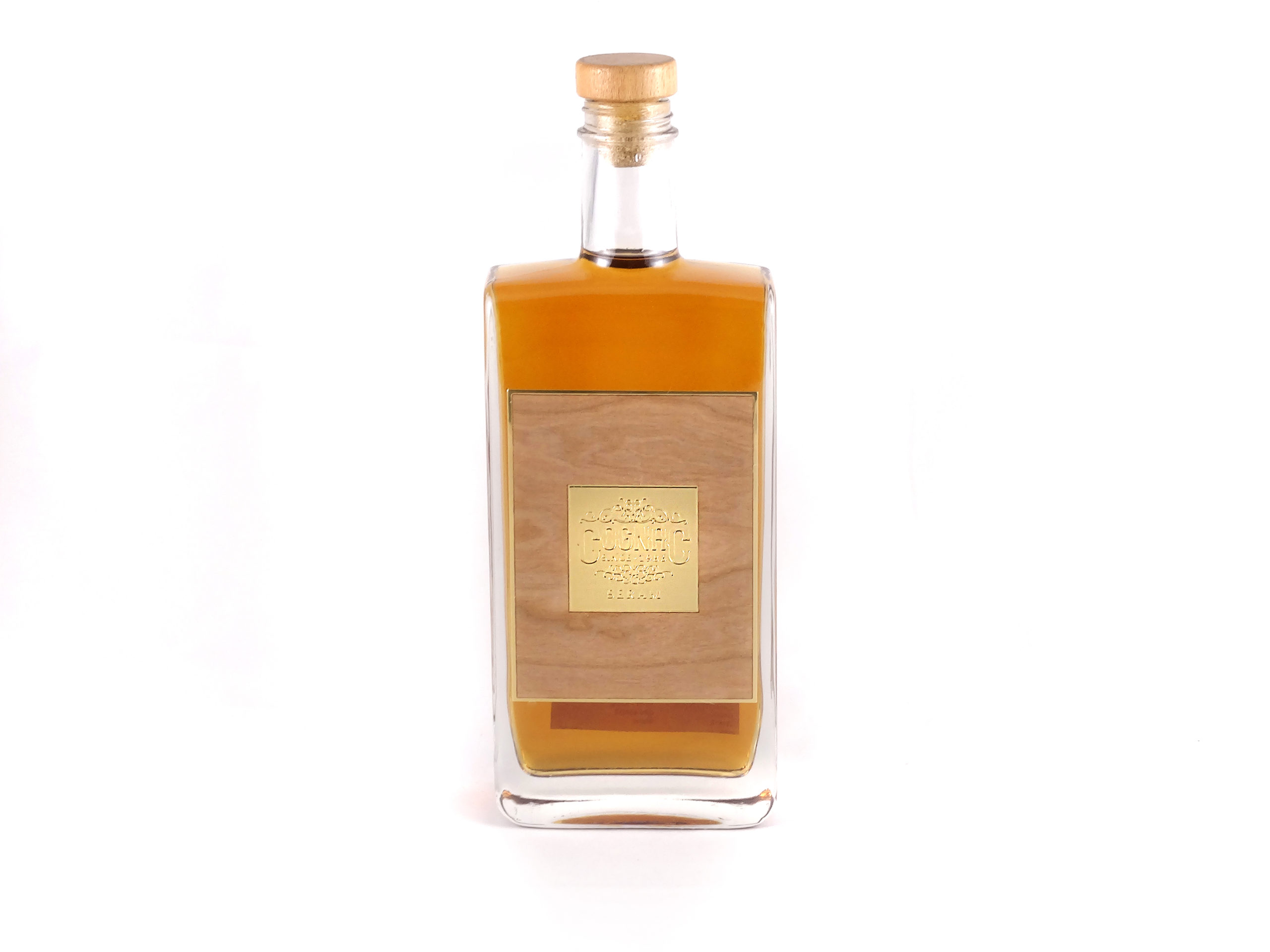 Embossed gold aluminum, imitation leather, wood, tweed and cork combine to form adhesive decorative plaques. Their refined shape, their measured opulence and their classic and natural tones echo the prestige of bottles and spirits brands, anchored in a legend, sometimes secular.