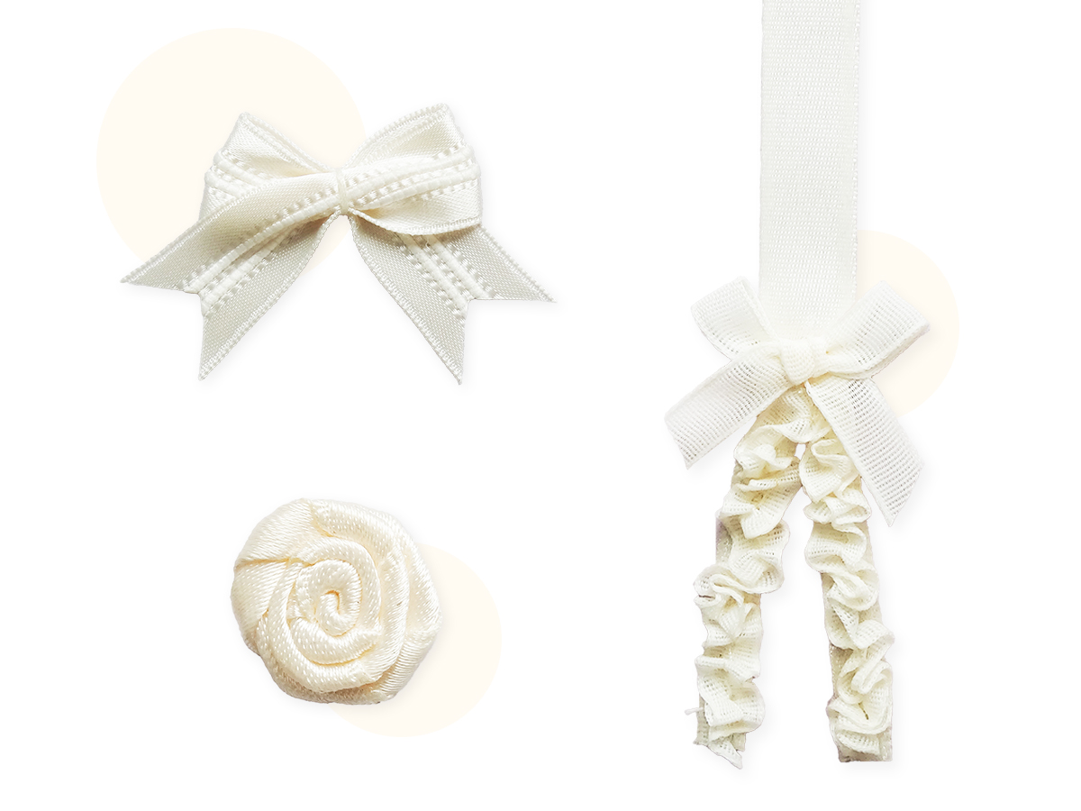 Du nœud en organza blanc au charme aérien à la rose tournée cousue avec délicatesse, en passant par le nœud en dentelle aux accents romantiques, chaque ornement textile apporte une touche d’exception à la lingerie de mariage.