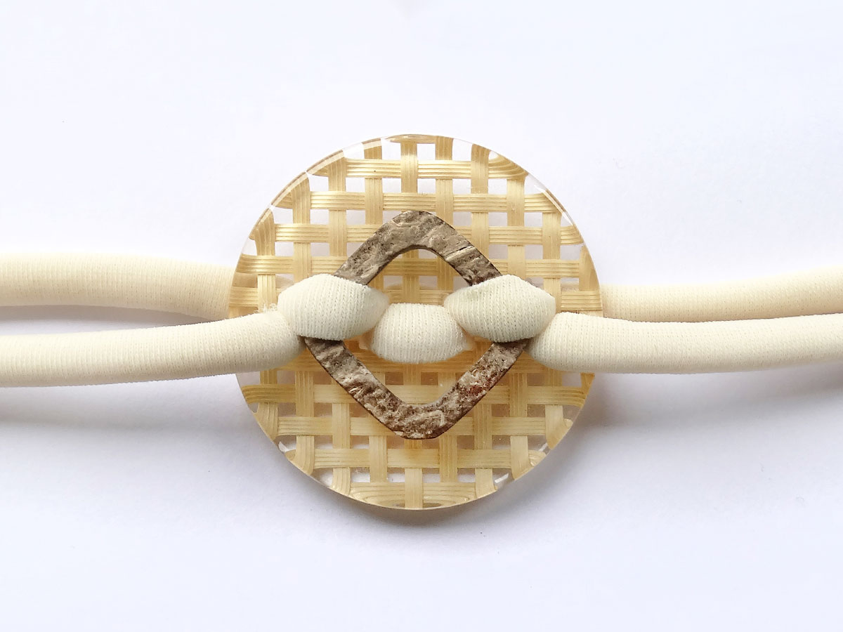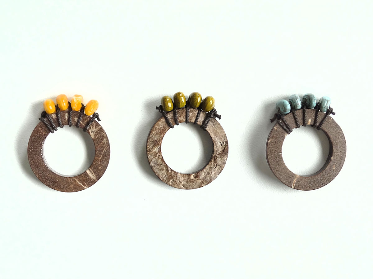 La coque de la noix de coco est travaillée en anneau, passant et médaille. Elle peut être associée à des perles aux couleurs acidulés et à un cordonnet coton. Toujours dans une optique de travailler des matières naturelles.