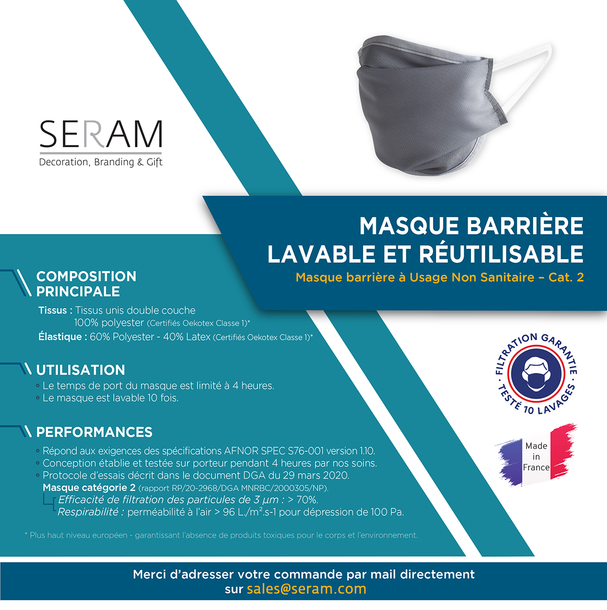 SERAM propose des masques barrières à usage non sanitaire de catégorie 2, répondant aux exigences des spécifications AFNOR.