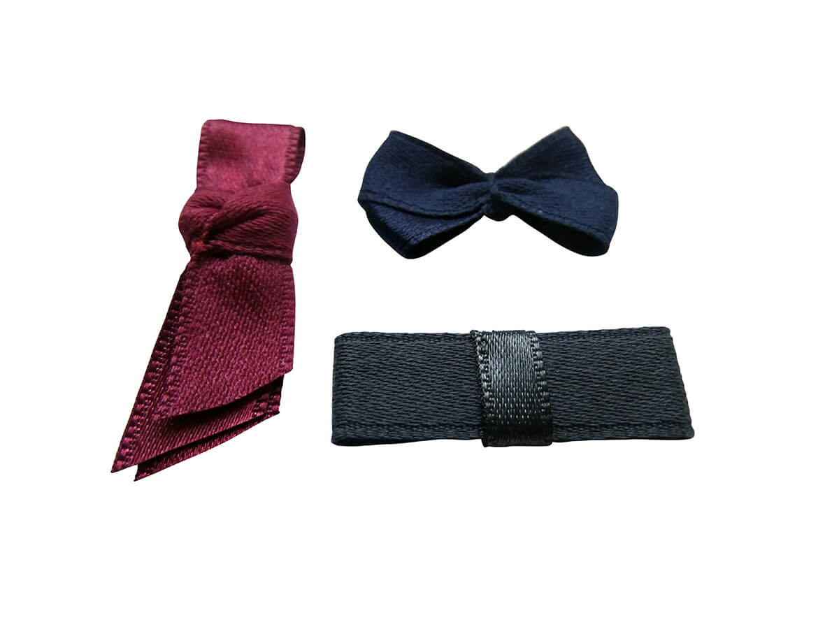 用亮面及哑光两种光泽效果的色丁带制作成的具有柔和形状的平结花,展现出新古典主义的理念。
